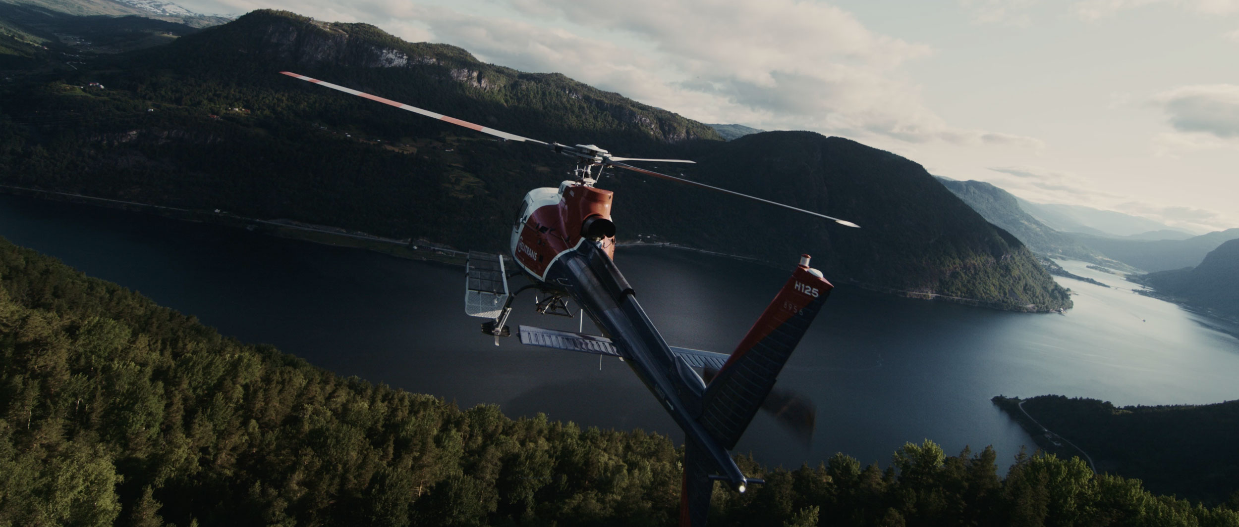 Bilde av et helikopter som flyr over norske fjorden